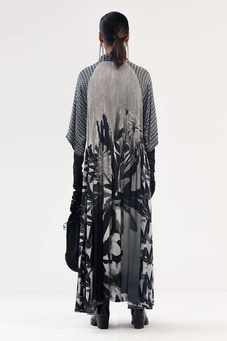 Black maxi shirt dress featuring three fourth sleeves, collar neck, and vase story bloom print