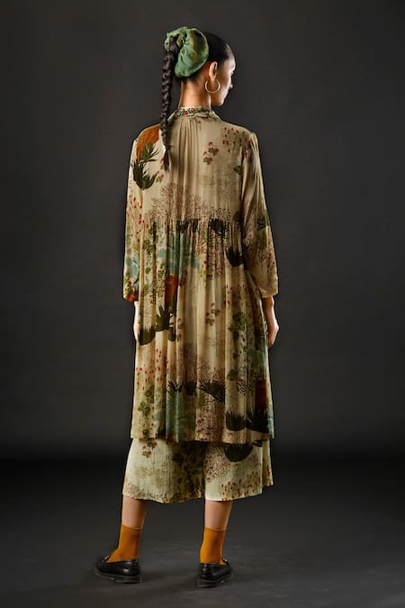 Ivory Moss Crepe Tropical Spread Collar Fawn Print Dress