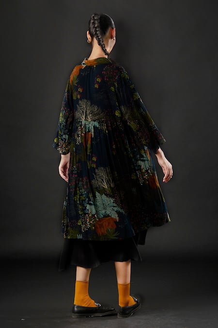 Navy blue dress with tropical print, front slit & gathered detailing.