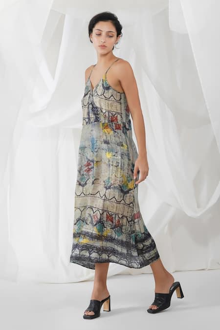 Buy_Yavi_Grey 100% Silk Geometric Motifs V Neck Insho Slip Dress_at_Aza_Fashions