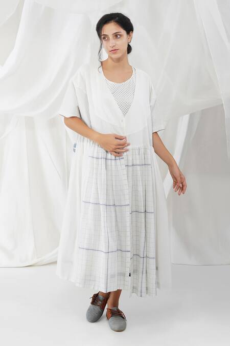 Buy_Yavi_White 100%cotton Checkered V Neck Kumo Print Dress_Online_at_Aza_Fashions