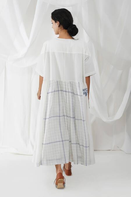 Ivory cotton dress with checkered printed motifs & panel details.