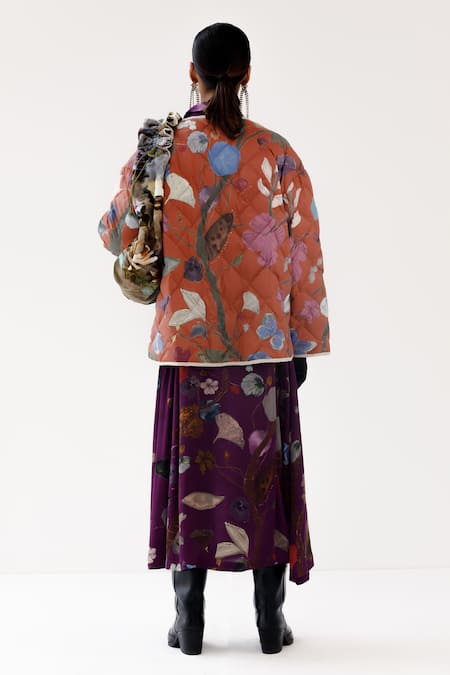 Orange Taffeta Round Neck Luna Floral Pattern Quilted Jacket