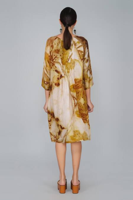 Multicolored leaf impression dress with abstract print & pintuck bodice.