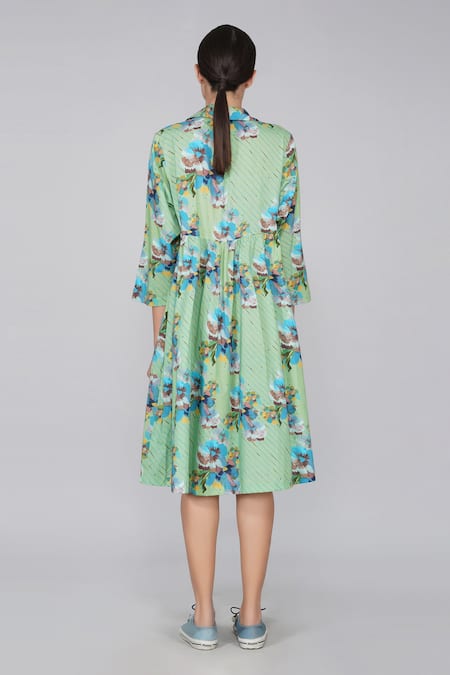 Mint midi dress with floral printed motifs, stripe detail & front button placket.