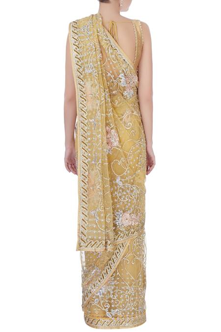 A vibrant yellow net saree is created in resham embroidery and silver sequin motifs. It features a unique scroll pattern and jaal work.