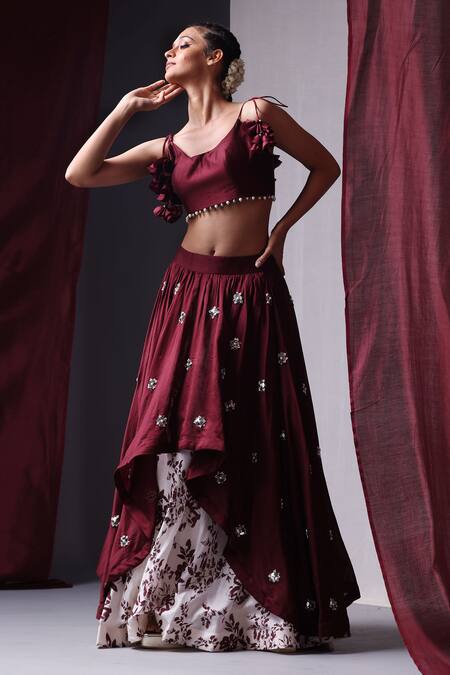 Maroon crop top with placement hand embroidery & tassel tie-ups. Comes with layered flared skirt enhanced with floral motif print.