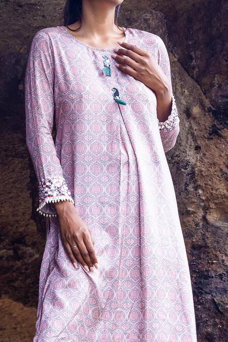 Blush pink pure muslin straight kurta featuring geometric print and hand embroidered sleeves hem with mirrors and tassels. Paired with matching pant for a complete look.