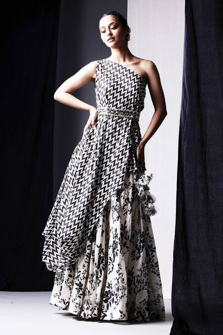 Off-white one-shoulder tunic with chevron print & uneven hem. Comes with floral print maxi skirt & hand embellished belt.