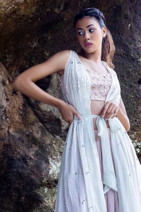 Onion pink lehenga set featuring a padded choli with mirror, pearl, and crystal embroidery. Paired with a pastel pista organza jacket and an organza belt.