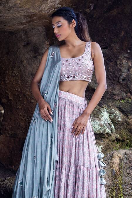 Blush pink floral printed lehenga featuring tiered design and side tassels. Paired with a scoop neck sleeveless choli embellished with pearl and crystal embroidery and a blue dupatta with mirror details.