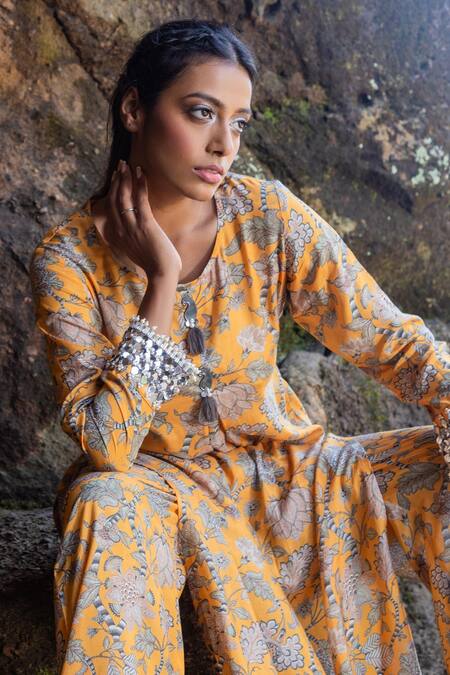 Yellow kurta featuring floral print with hand embroidered sleeves hem and front patch of mirrors and tassels. Paired with matching pant in pure muslin fabric.