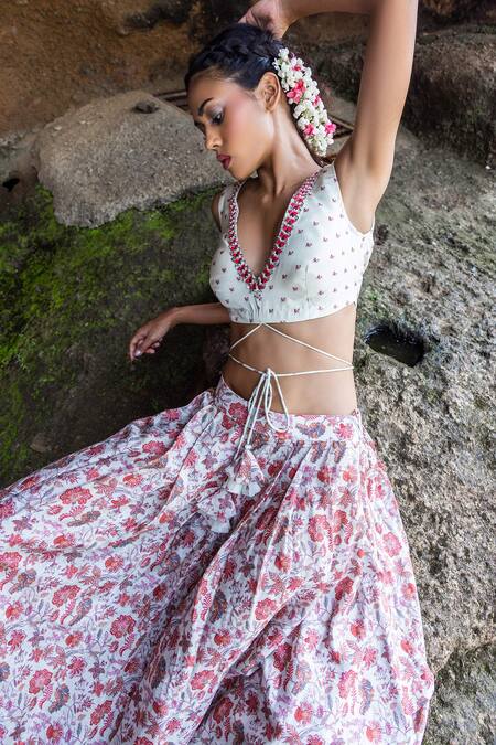 Off white waist tie top featuring a V neckline with embroidered details and mirror work. Paired with a draped skirt showcasing a red floral print and pleated details.