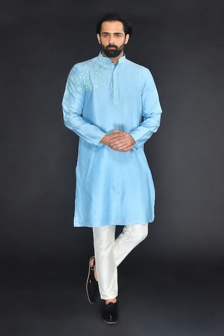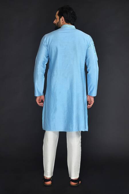 Sky blue kurta with zari thread embroidery in flower pattern. Paired with off-white pant.