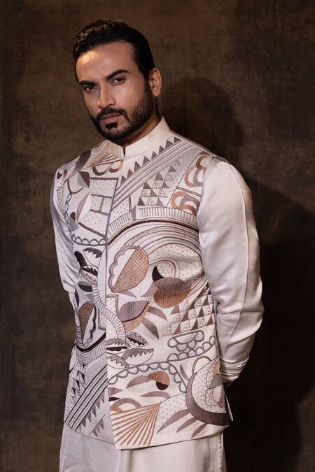 Geometric embroidery design on the jacket, Stand collar detail, Full sleeves on kurta