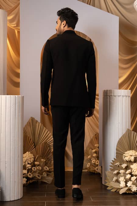 Black bandhgala featuring floral embroidery and pintuck details. Paired with a matching trouser.