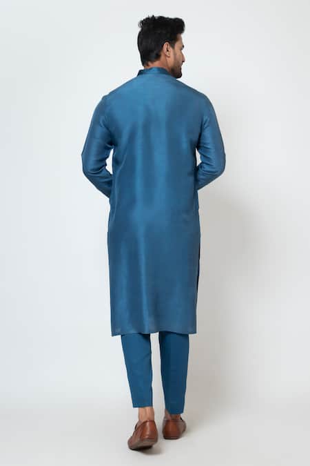 Navy blue kurta featuring full sleeves, collared neck, and intricate tidal wave inspired embroidery with cutdana embellishments. Paired with matching slim fit pants in malai cotton.