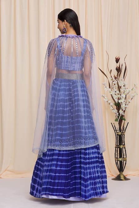 Ink blue tie & dye high waisted lehenga with glass beaded hand embroidery waistband. Paired with blouse with zardozi cutwork embroidery & linear sequins embroidery. Comes with pleated satin collar cape with sequins, mirror work embroidery & scattered crystals.