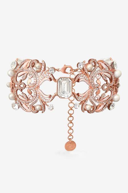 Gold choker featuring cutwork detail, hand painted enamel, and embellished pearls