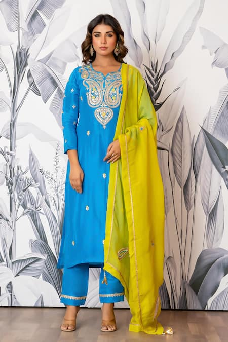 Buy_Yuvraani Jaipur_Blue Silk, Shantoon, Organza Embroidery, Sequins Round Neck Kurta Set