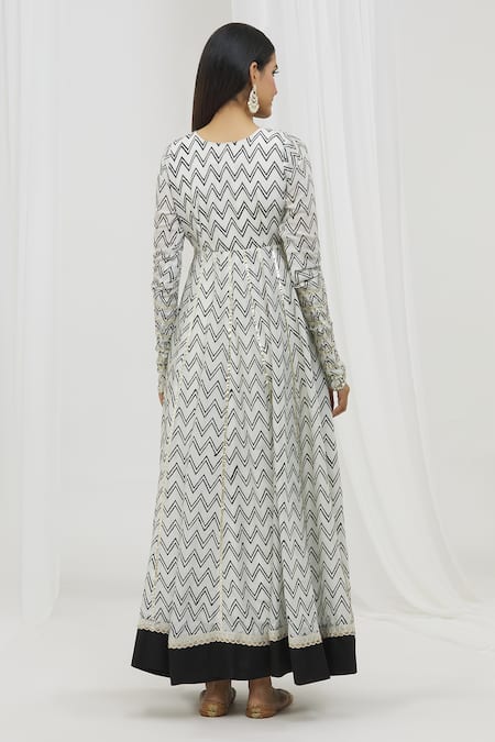 Black and white Anarkali featuring chevron handblock prints and mirror hand embroidery on the yoke. Paired with a matching tassel edge dupatta.
