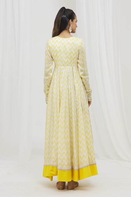 Yellow anarkali featuring chevron print all-over with gota patti trims and mirror work on the yoke. Paired with a mirror work dupatta with cutwork border.