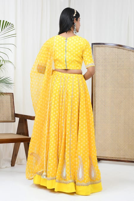 Yellow lehenga featuring floral print and paisley dabka embroidery. Paired with a matching blouse and dupatta, both crafted in chanderi organza.
