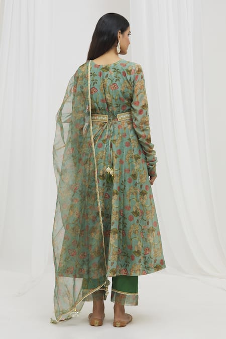 Mint green anarkali featuring all-over floral print and marodi work on the neckline. Paired with a printed dupatta, pant with sheer panel at the hem, and a belt with back tie-up.