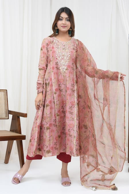 Brown Organza, Chanderi Embroidery Round Neck Floral Print Kurta Pant Set