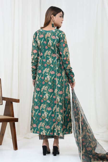 Bottle green chanderi flared kurta featuring floral print and thread embroidery. Paired with coordinating solid pant and dupatta, designed for a relaxed fit.