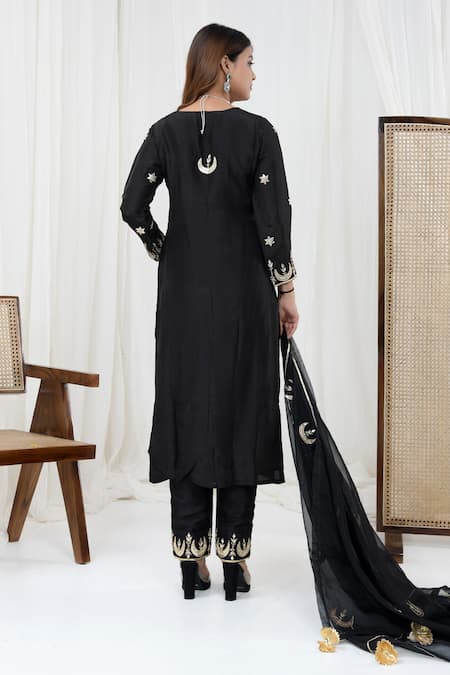 Black Silk, Organza, Cotton Embroidery, Gota Patti V-neck Kurta Pant Set