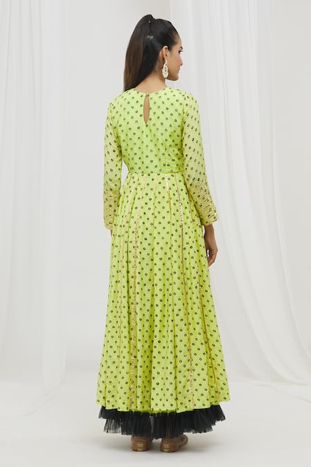 Neon green anarkali featuring handblock prints with dori and dabka hand embroidery. Paired with a matching dupatta that has frill details at the hem.