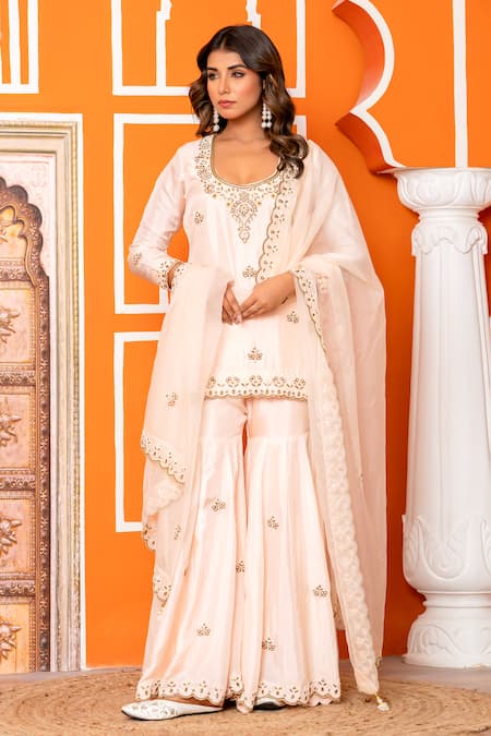 Peach silk kurta featuring intricate embroidery and a round neckline. Paired with a matching sharara and an organza dupatta adorned with embroidery.