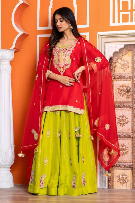 Red Silk, Organza Sequins, Embroidery Round Neck Lehenga Kurta Set