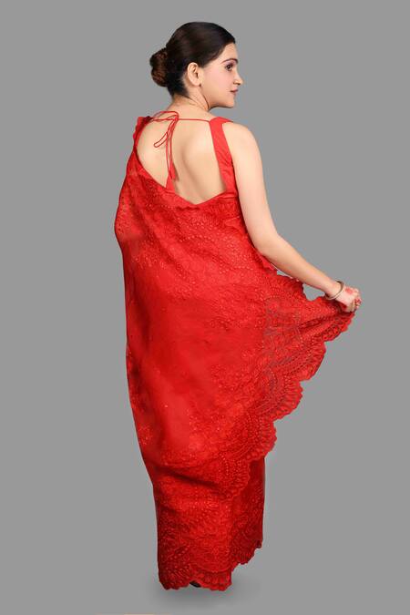Red saree made from pure organza silk featuring intricate chikankari cutwork hand embroidery. Includes an unstitched blouse piece for customization.
