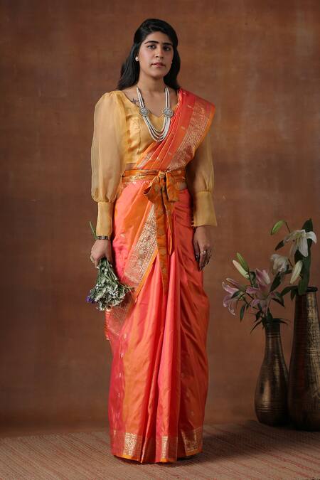 Buy_Zal From Benaras_Orange Silk Flower Bud Butti Pattern Saree With Unstitched Blouse Piece_at_Aza_Fashions