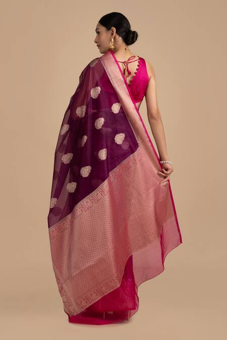 Pink kora handloom silk Banarasi saree featuring a woven border and pallu. Comes with an unstitched blouse piece for customization.