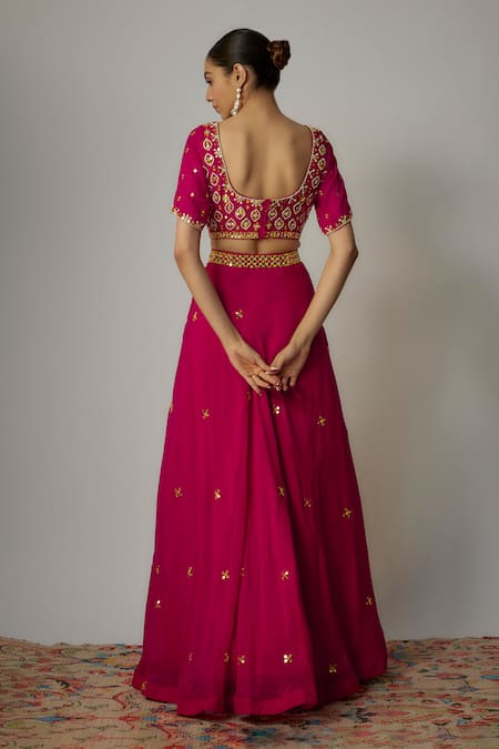 Pink Georgette Beads, Mirrors V-neck Work Lehenga Set