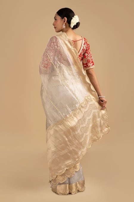 Silver Tissue, Embroidered Scallop Border Saree With Unstitched Blouse Piece