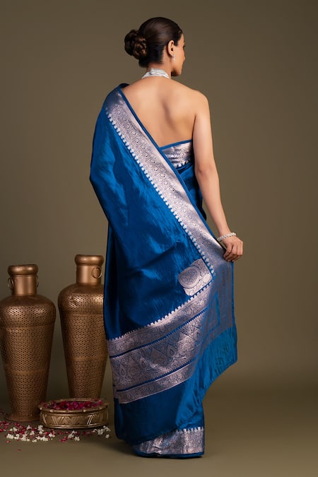 Blue saree made from pure Katan silk featuring hand-woven designs. Accompanied by an unstitched blouse piece.