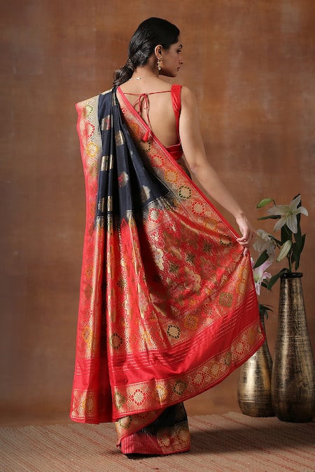 Black pure silk saree featuring an all-over mandala butti pattern. Comes with an unstitched blouse piece.