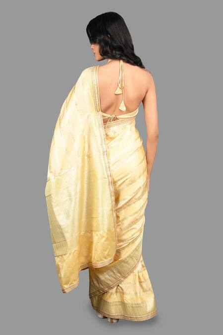 Gold banarasi handloom saree crafted in pure silk featuring bahar vine striped woven details. Paired with an unstitched blouse piece.