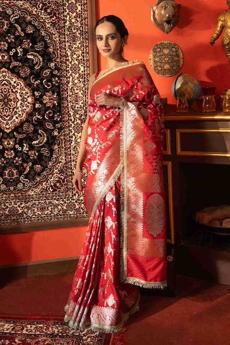 Red saree featuring intricate jangla work with a fringe border. Comes with an unstitched blouse piece for customization.