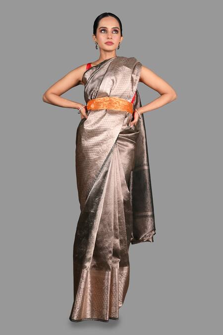 Grey tissue silk banarasi saree featuring tonal floral brocade border. Paired with a coordinating unstitched blouse piece.