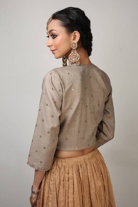 Antique gold lehenga in banarasi silk with aari zardozi embroidery. Paired with a contrasting stripe chanderi blouse & a tissue chanderi dupatta.