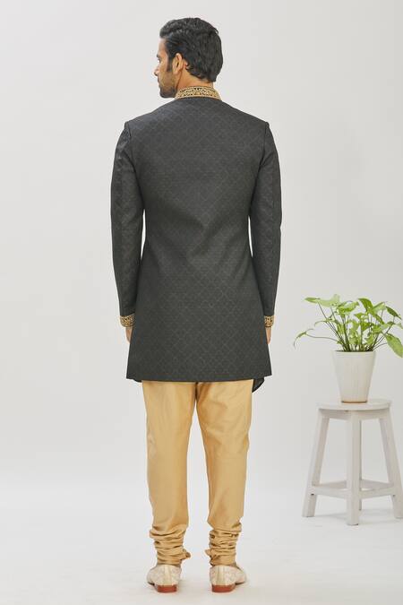Buy_Mapxencars_Black Silk Floral Zardozi Embroidered Sherwani Set_at_Aza_Fashions
