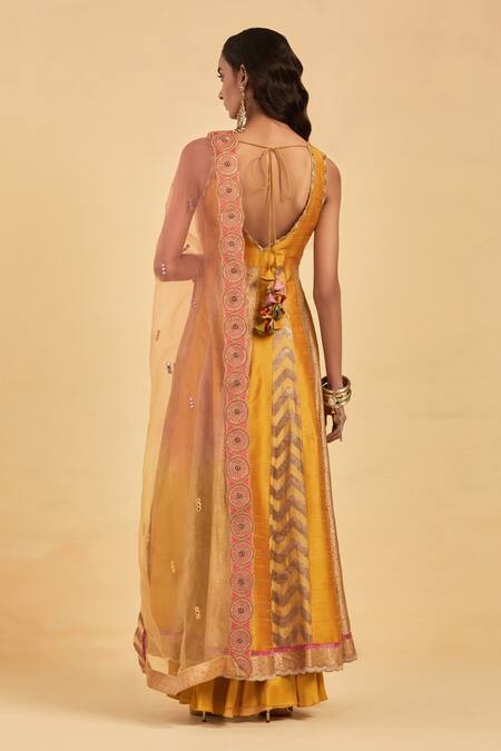 Buy_Aum By Asit And Ashima_Yellow Banarasi Silk Hand Embroidery Zardozi Plunge V Neck Anarkali And Skirt Set_Online_at_Aza_Fashions