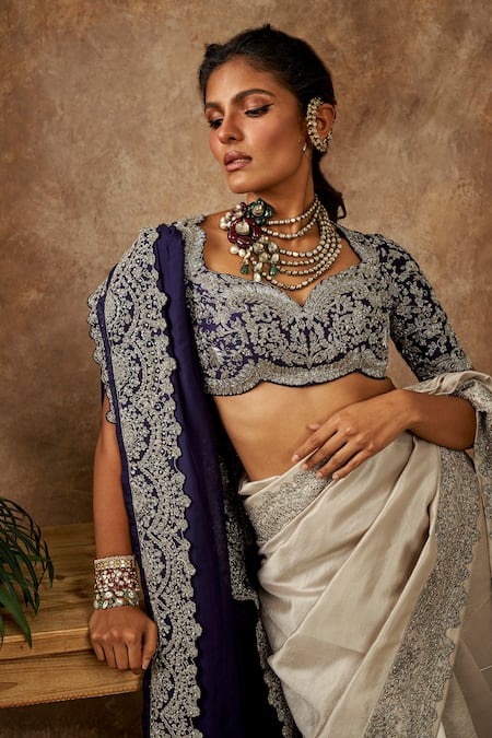 Beige saree in silk base fabric featuring intricate zardozi embroidered borders. Paired with contrast purple embroidered blouse with scalloped hem & embroidered dupatta.