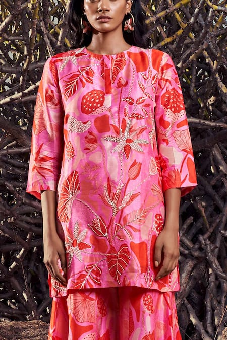 Pink kurta with floral motifs & placement zardozi embroidery. Paired with floral motif sharara.
