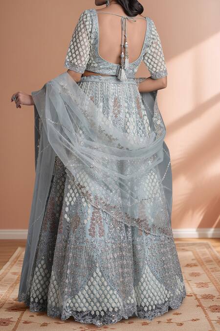 Light blue lehenga featuring an attached cancan, intricate embroidery and a flared silhouette. Paired with a matching padded blouse and net dupatta.
